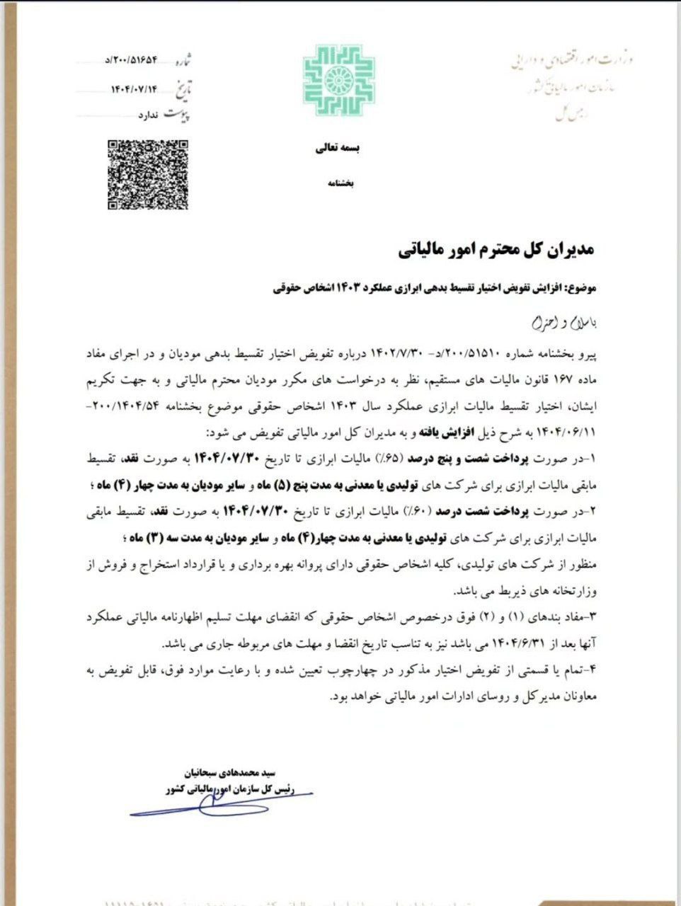 بخشنامه افزایش تفویض اختیار تقسیط مالیات عملکرد1403 اشخاص حقوقی